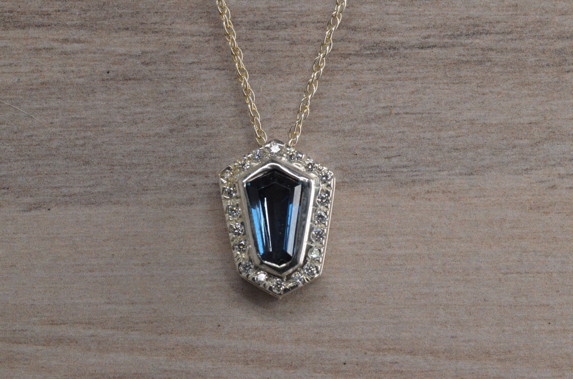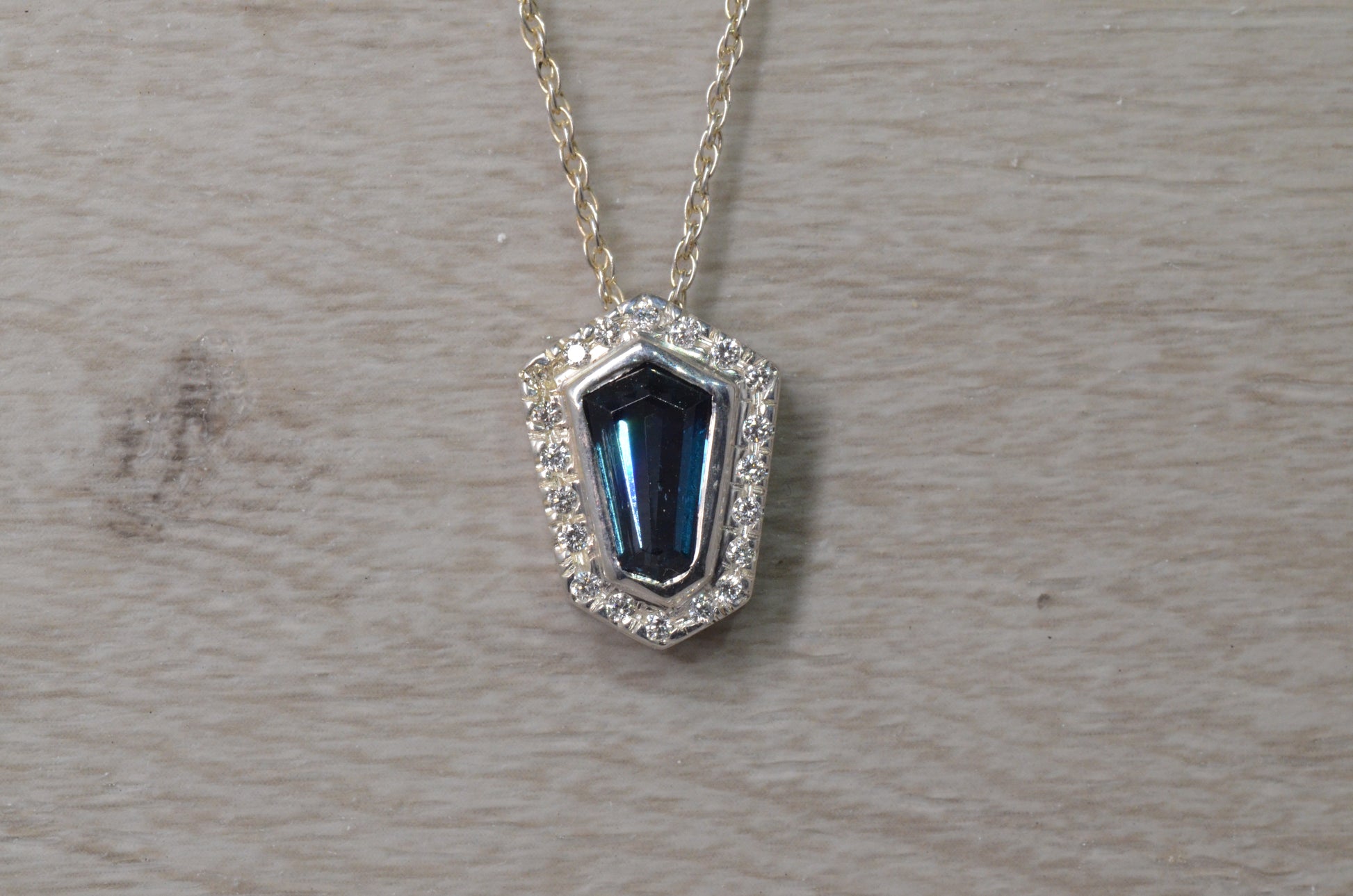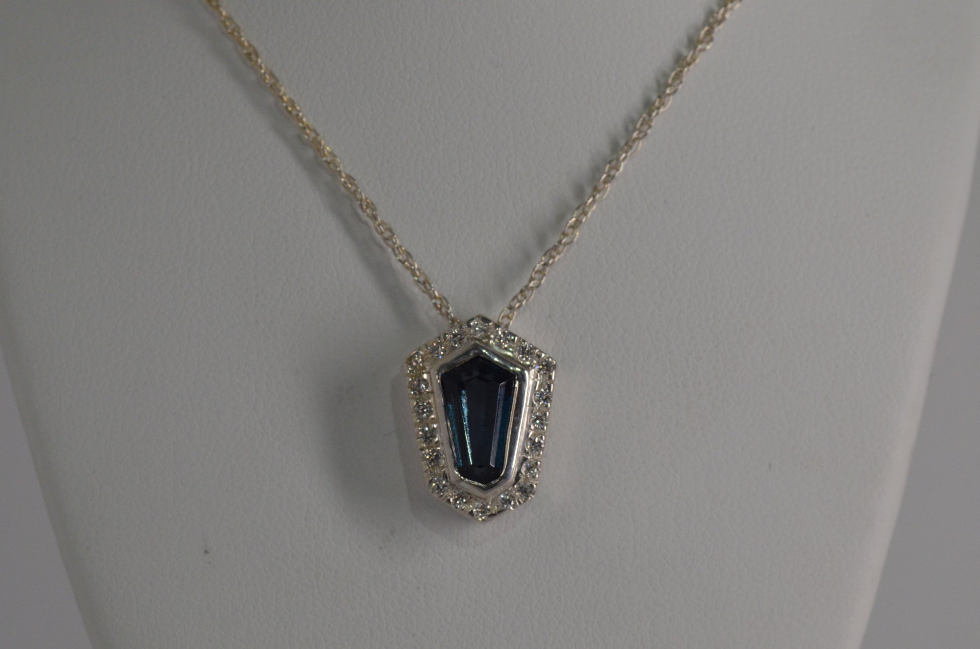 This beautiful sterling silver pendant features a 2.68ct London blue topaz with a halo of 0.27ct of lab diamonds. Complimented by an 18 inch double rope chain.